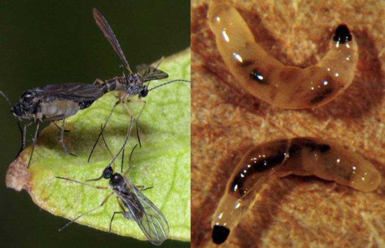 Третье — это появление грибного комарика, земляной мушки и прочее. Похожи на дрозофилу. Личинки питаются органикой в почве. А еще, я так понимаю, и гриндалем. По наблюдениям, там, где есть эти личинки, численность червя уменьшается. Выводится обычными спиралями, таблетками от насекомых, не за один два дня… тут придется попотеть.