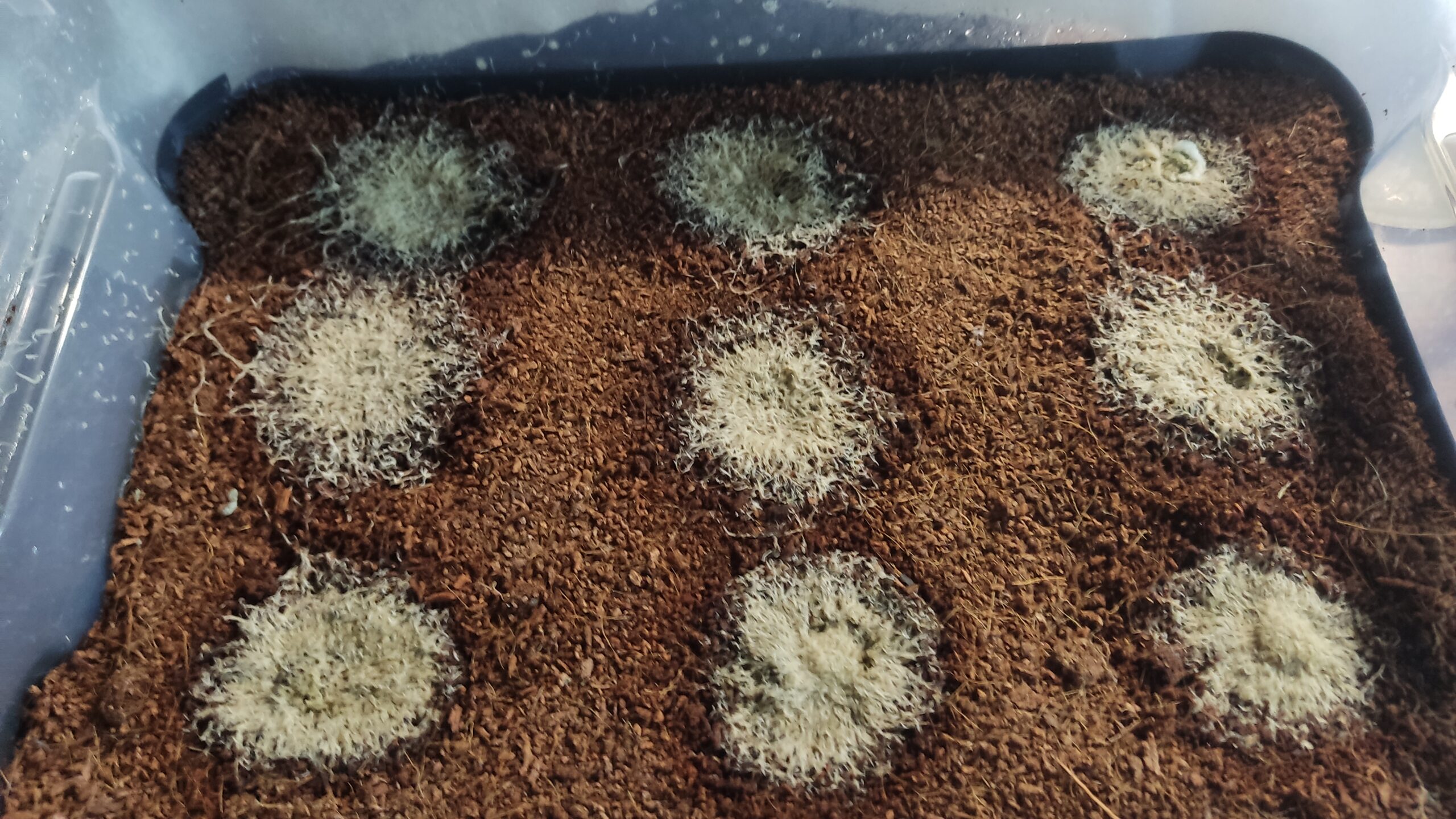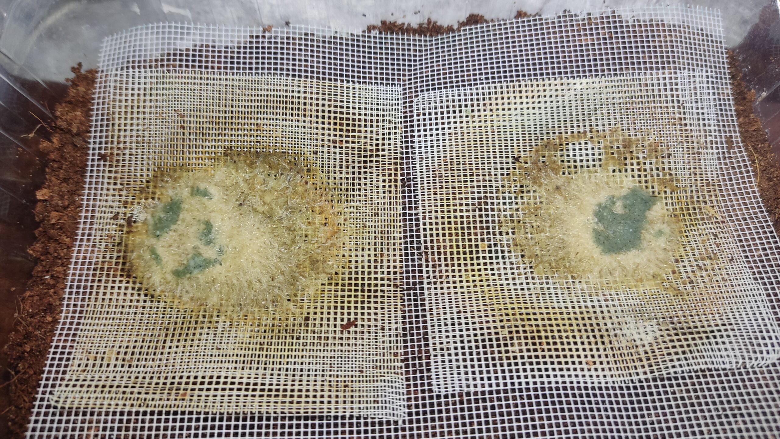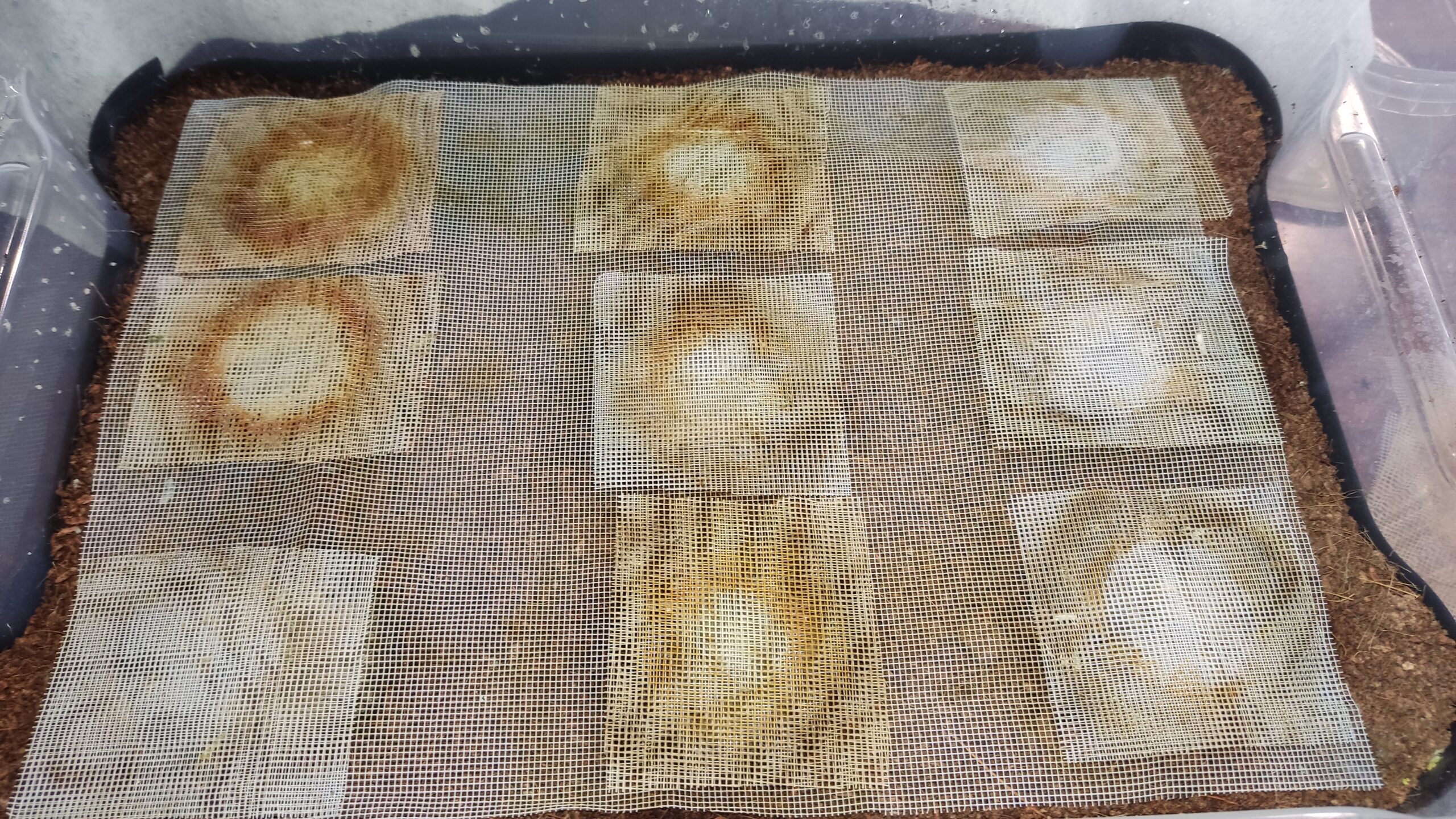 На гнездо выкладываем первую сетку. Она может быть по все поверхности контейнера, может быть отдельными кусками, специально для каждого гнезда. Кстати, мне этот вариант больше нравится, так как становится удобнее следить за культурой и за отдельными колониями по отдельности.