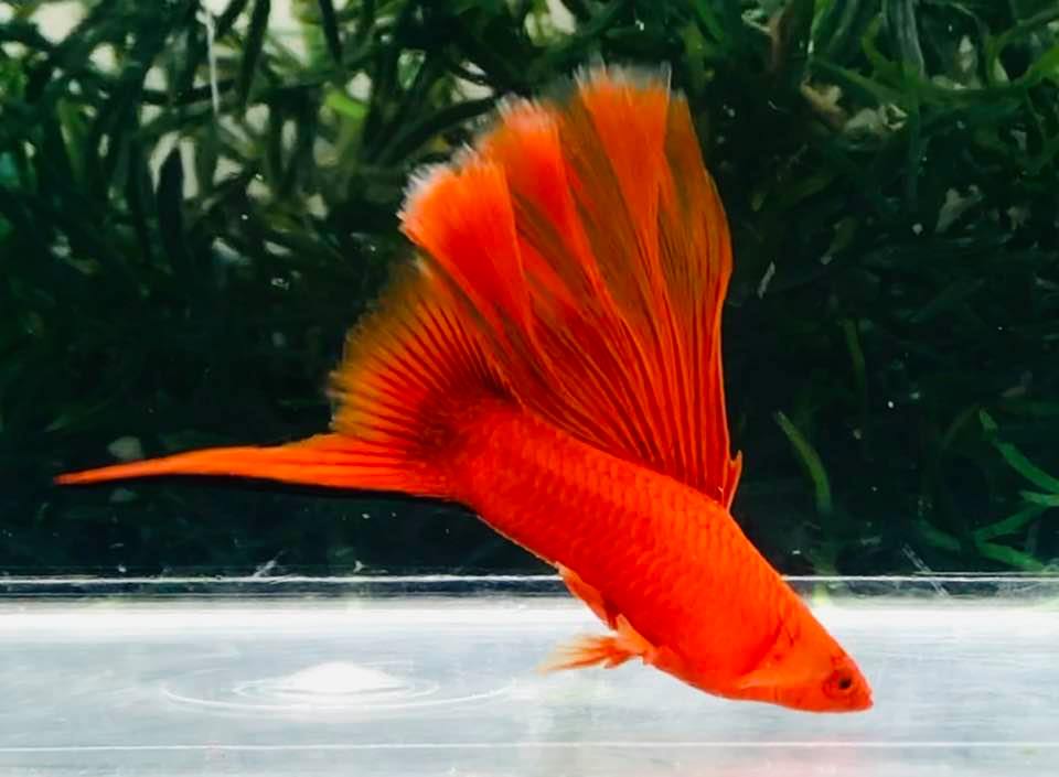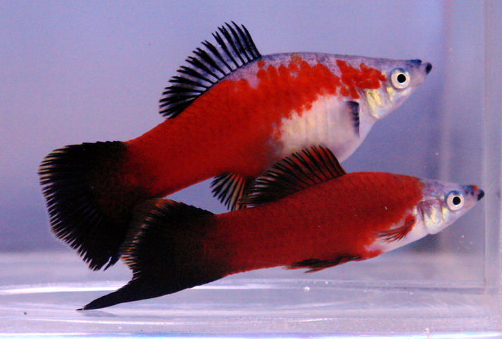 Меченосцев красного цвета и хвостовым плавником с одним удлиненным лучом, окрашенным в черный цвет, можно назвать «классической» и наиболее узнаваемой аквариумной вариацией. В условиях аквариума рыбки вырастают до 8-10 см.