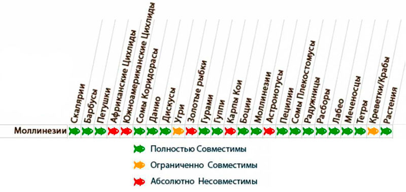 Миролюбивость – еще одна положительная характеристика моллинезий. Она делает их удобными для содержания в общих аквариумах. При этом, чтобы избежать конфликтов внутри самой стаи моллинезий, в ней должны преобладать женские особи из расчета 3-4 самки на одного самца. Подбирая соседей, рекомендуется отдать предпочтение рыбам, схожим по размерам. Рыбки хорошо уживаются с данио, сомиками, анциструсами.