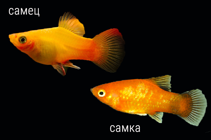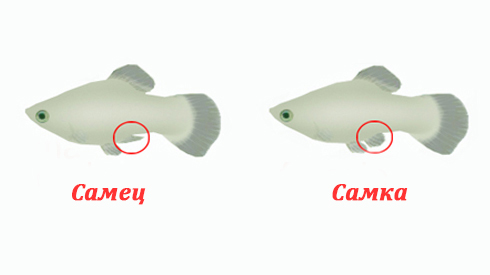 Пецилии являются живородящими рыбками и, как и у всех живородок, у них ярко выражены половые признаки. Самки отличаются менее красочной окраской и более крупными размерами, их брюшко более округлое. Самцы не только значительно меньше самок, но и более яркие, самое важное отличие – это имеющийся у них гоноподий. Это орган, позволяющий оплодотворять самок – он служит своеобразным желобом, по которому половые продукты попадают в брюшко самки. А чтобы самцу было легче удерживаться возле самки во время оплодотворения, на конце гоноподия имеется специальный крючок.