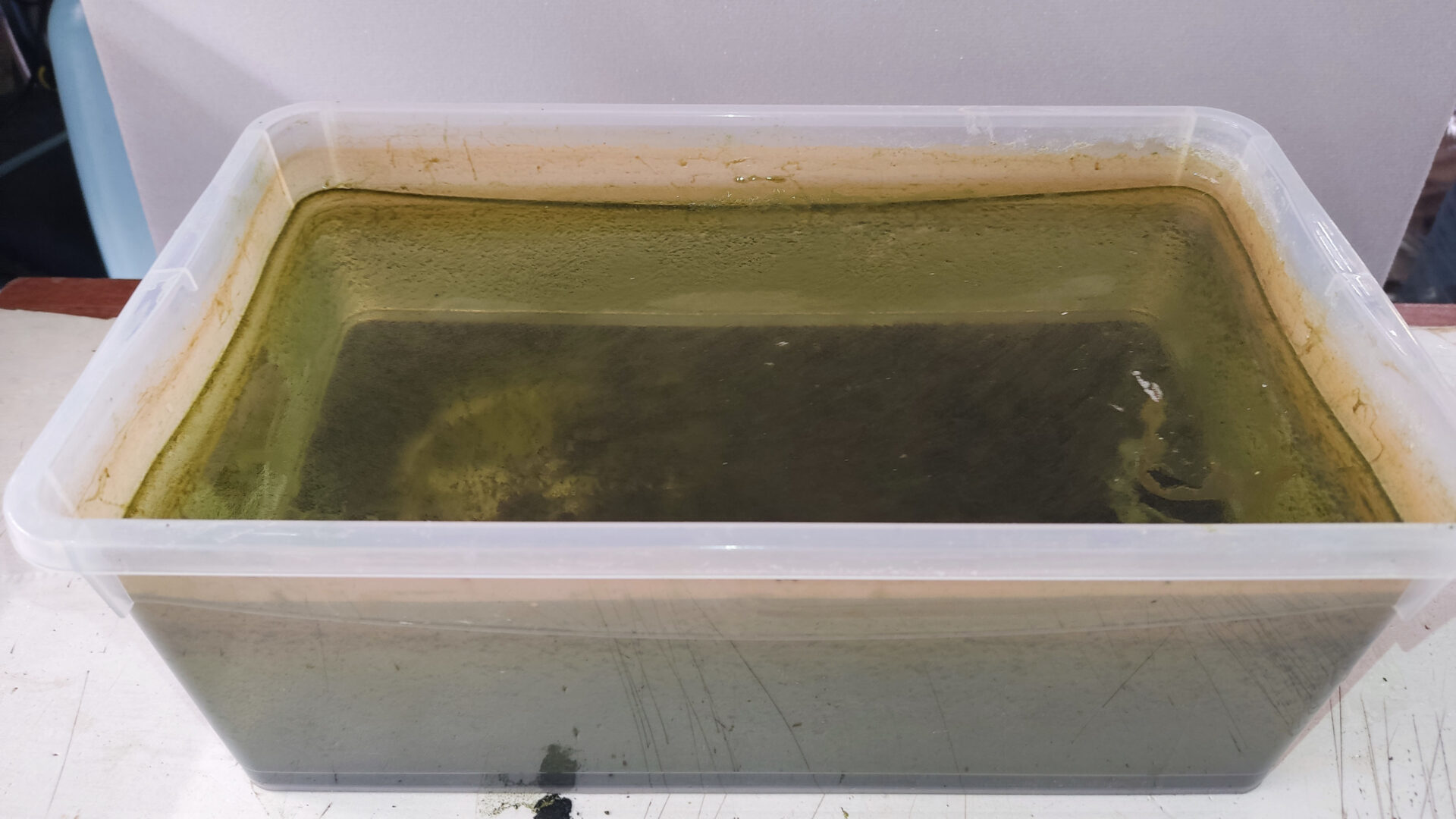 Систематические подмены воды я не делаю. Потому что периодически сливаю коловратку на корм через сачок, не возвращая старую воду в культиватор. Свежую соленую воду начинаю доливать как уровень воды опустится на 1/3 в контейнере. Плюс, как я писал ранее, иногда заливаю в культуру живой тетраселмис. Он уровень воды и восполняет.