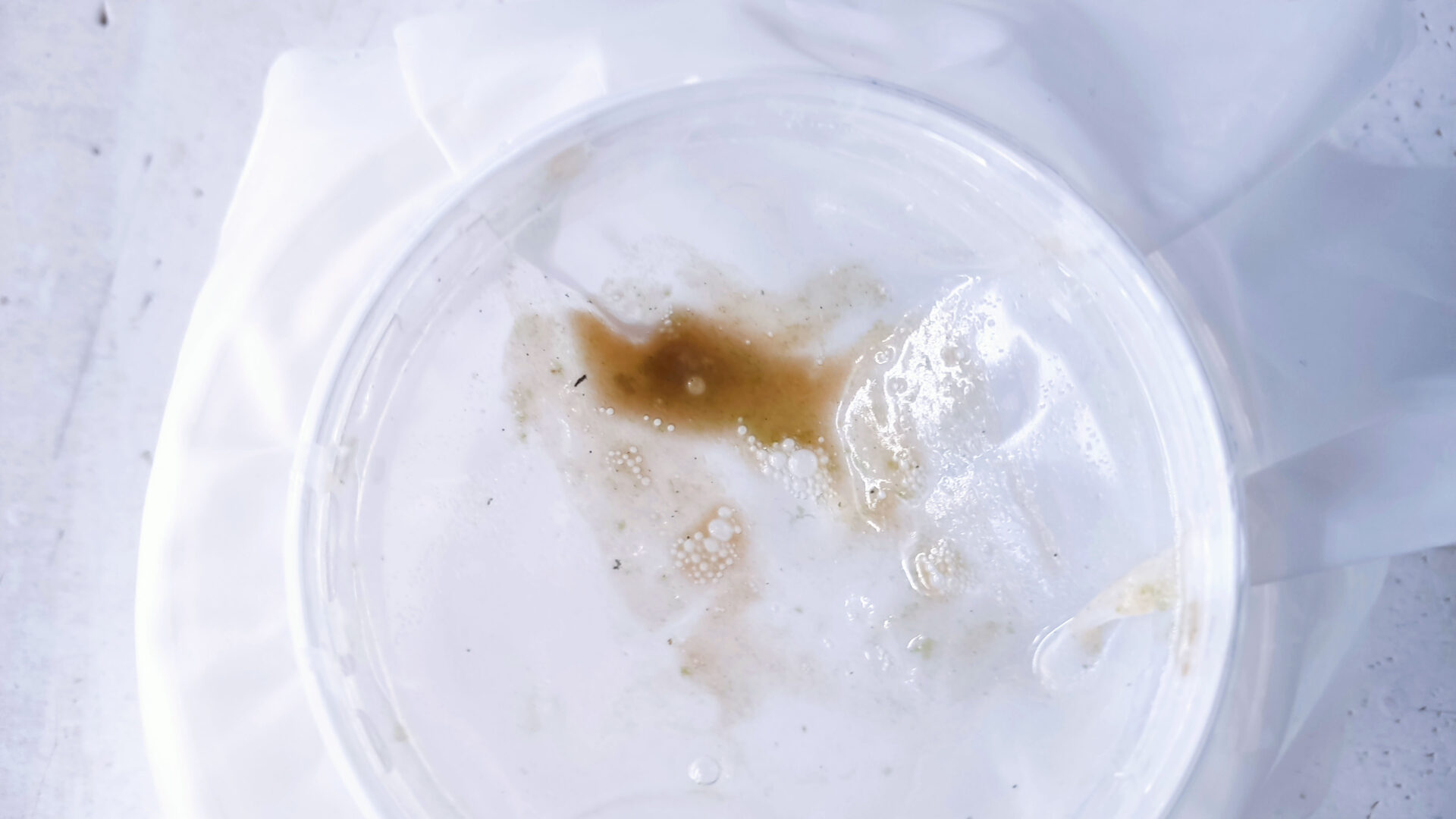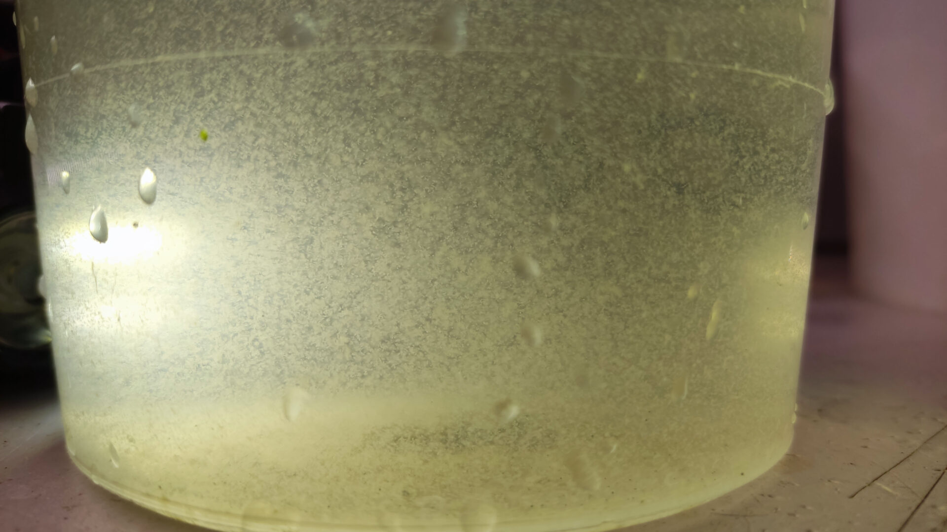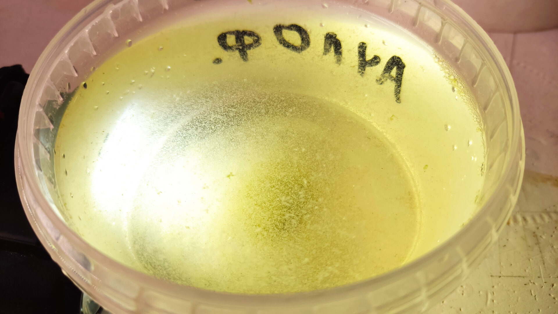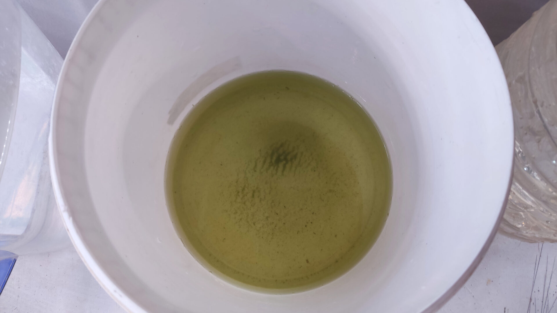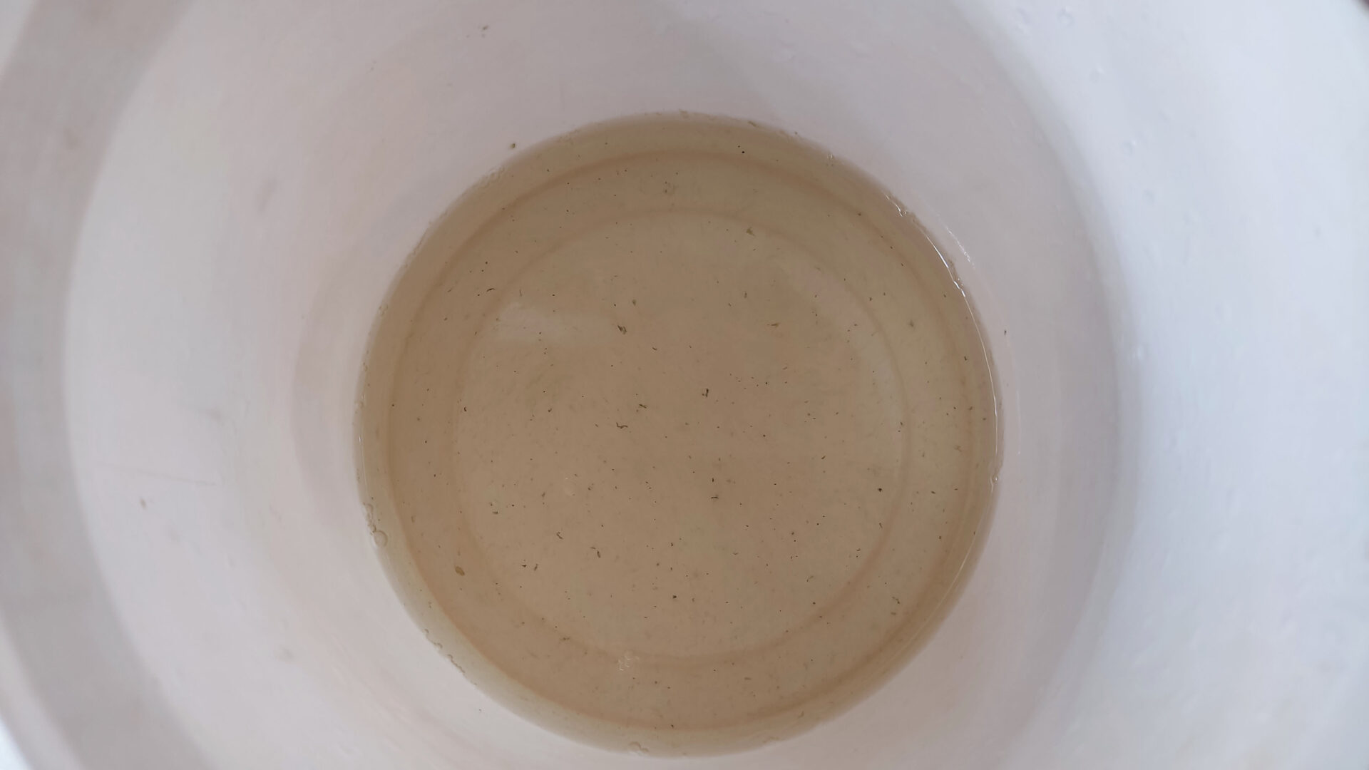 - Переливаем содержимое контейнера в литровую ёмкость. Начинаем по чуть чуть добавлять своей подготовленной воды. Примерные параметры моей воды, на которой держатся культуры: РН — 7.5, GH — 15. Температура: 24-28 градусов.