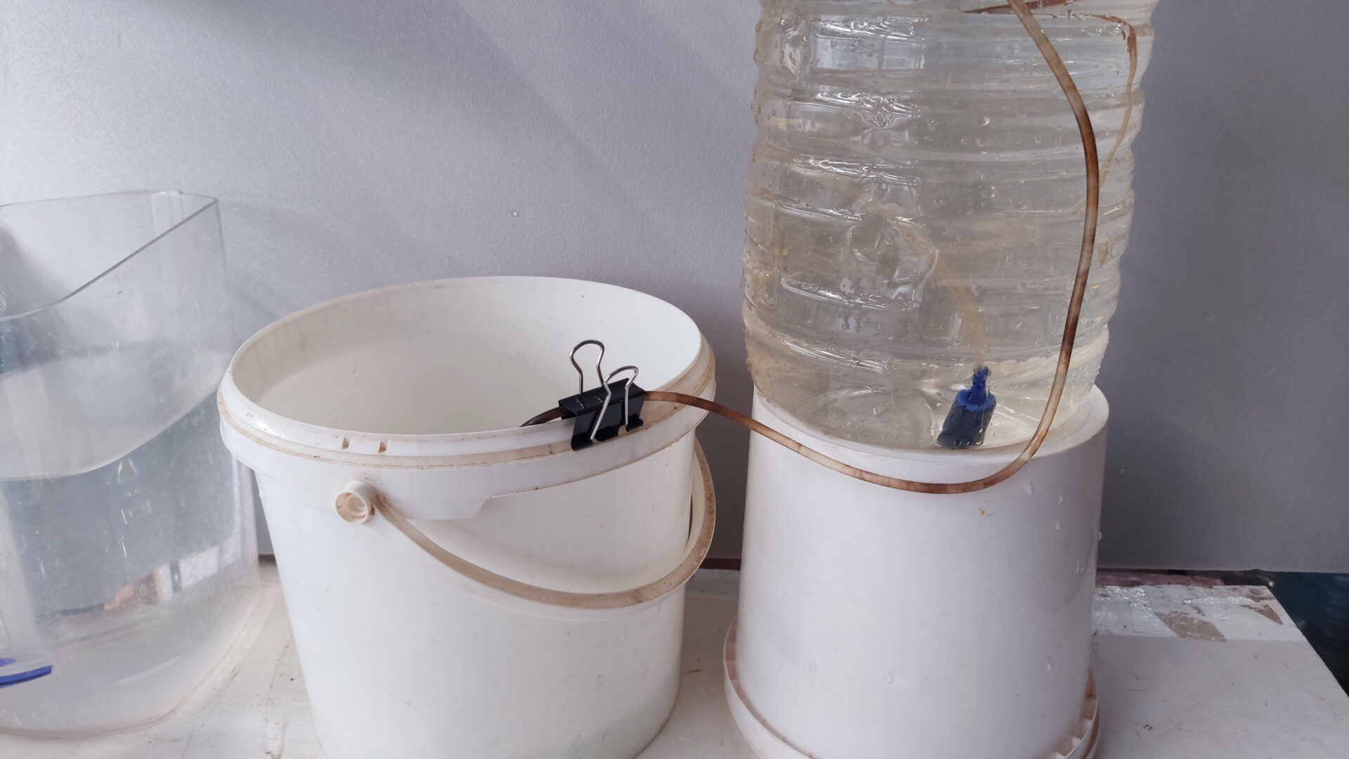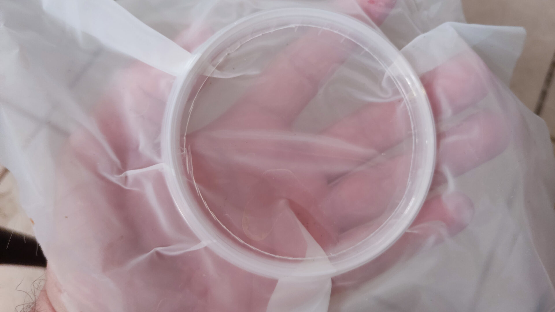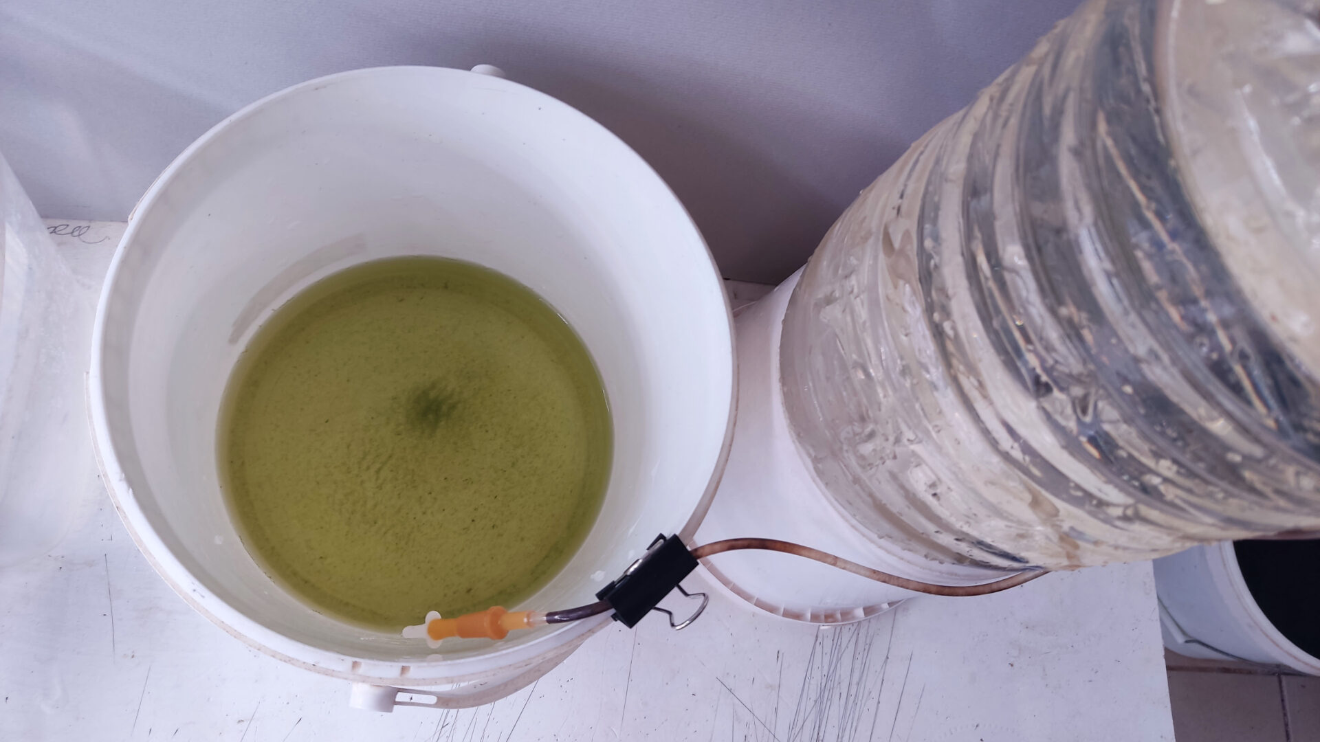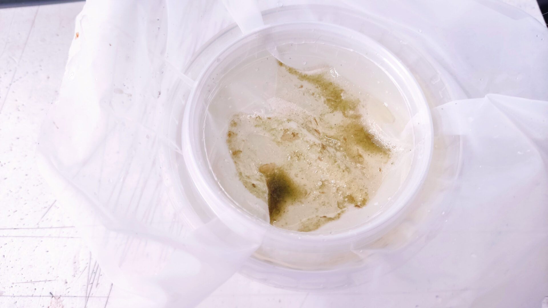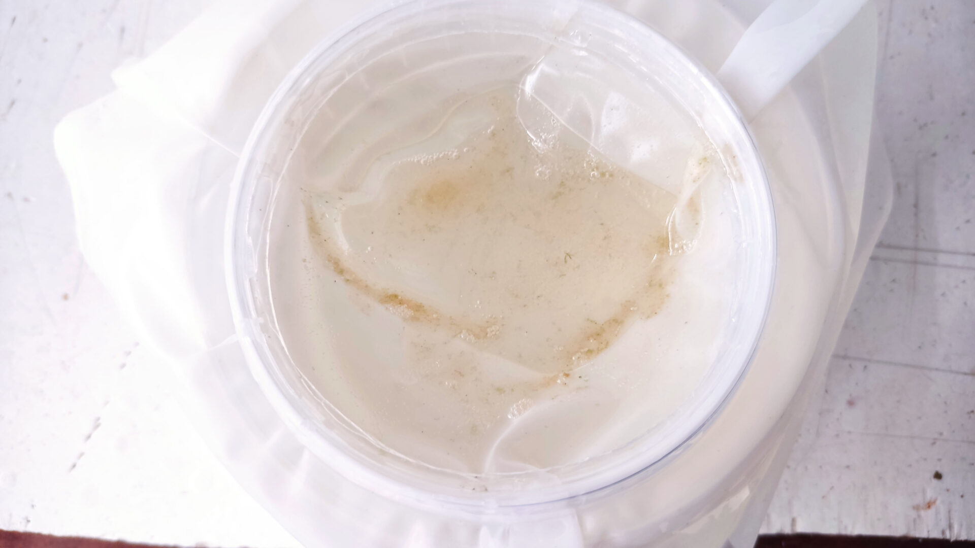 - Переливаем содержимое контейнера в литровую ёмкость. Начинаем по чуть чуть добавлять своей подготовленной воды. Примерные параметры моей воды, на которой держатся культуры: РН — 7.5, GH — 15. Температура: 24-28 градусов.