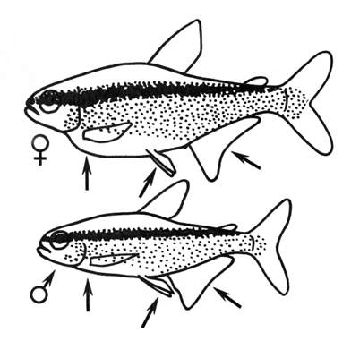 Примечательно, что у самцов неоновая полоска представляет собой прямую линию, а у самок она посередине имеет небольшой излом. Поэтому специалист без труда отличит самца от самки.