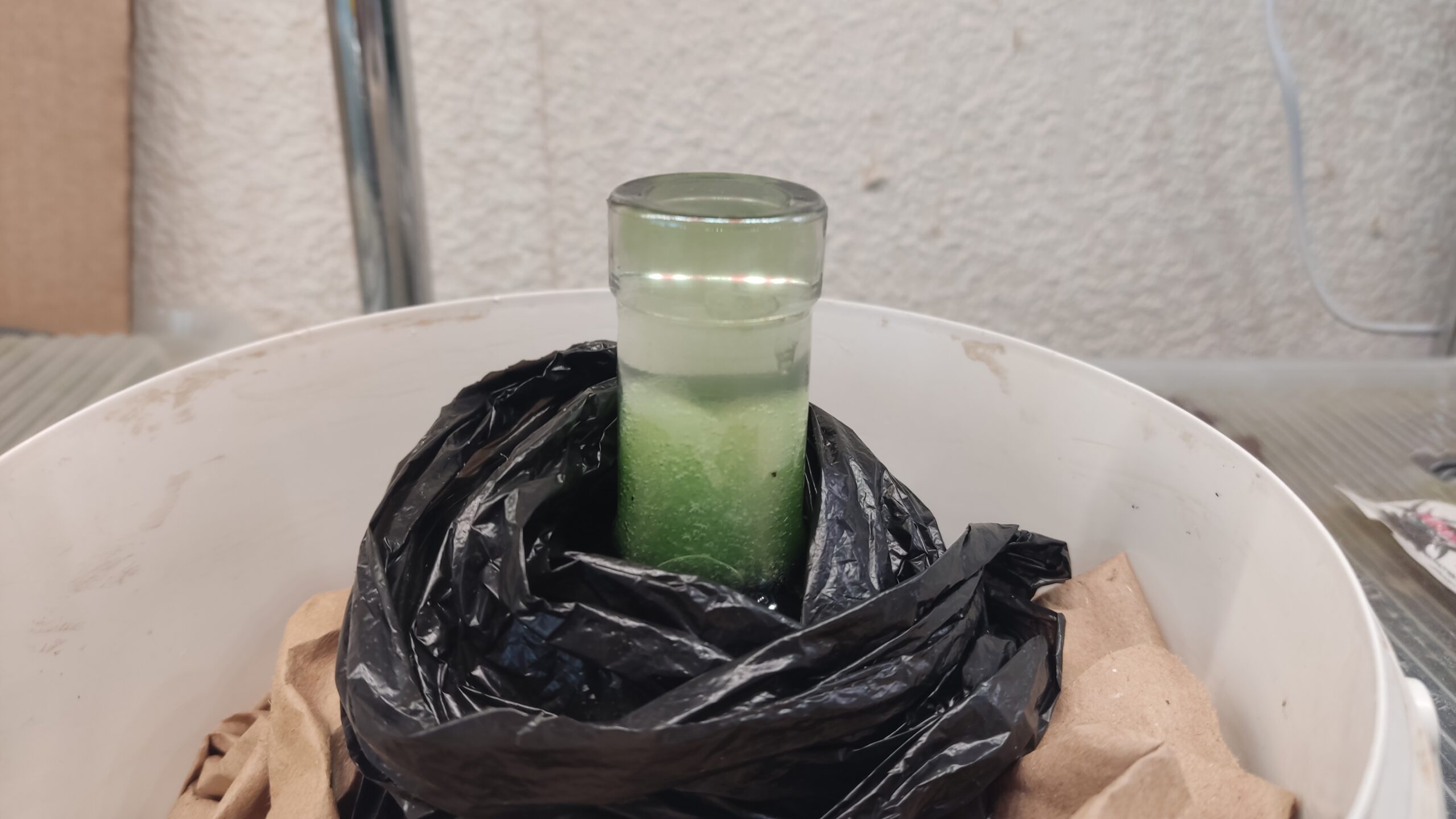 Хоть тетраселмис клетка и крупная, но все равно через обычную ткань (мельничный газ) ее отфильтровать не получится. Размер ячейки самого тонкого газа в 2 раза больше чем водоросль. Поэтому нам понадобится прозрачная бутылка с высоким горлом и губка. Подходит мелкопористая и крупнопористая. Принцип тут такой же, как при фильтрации инфузории.